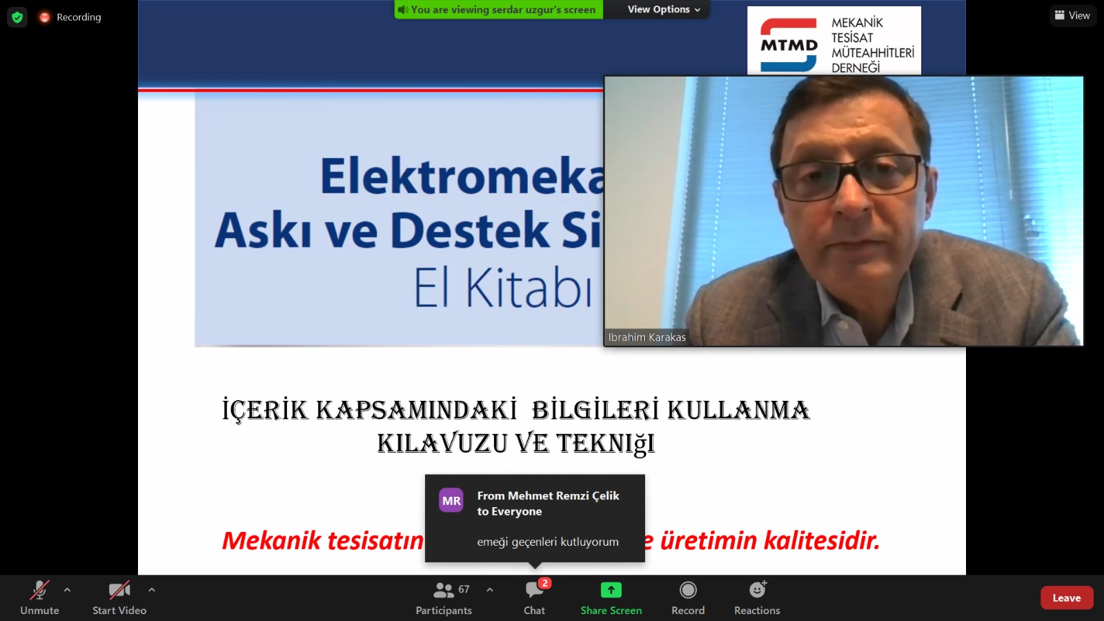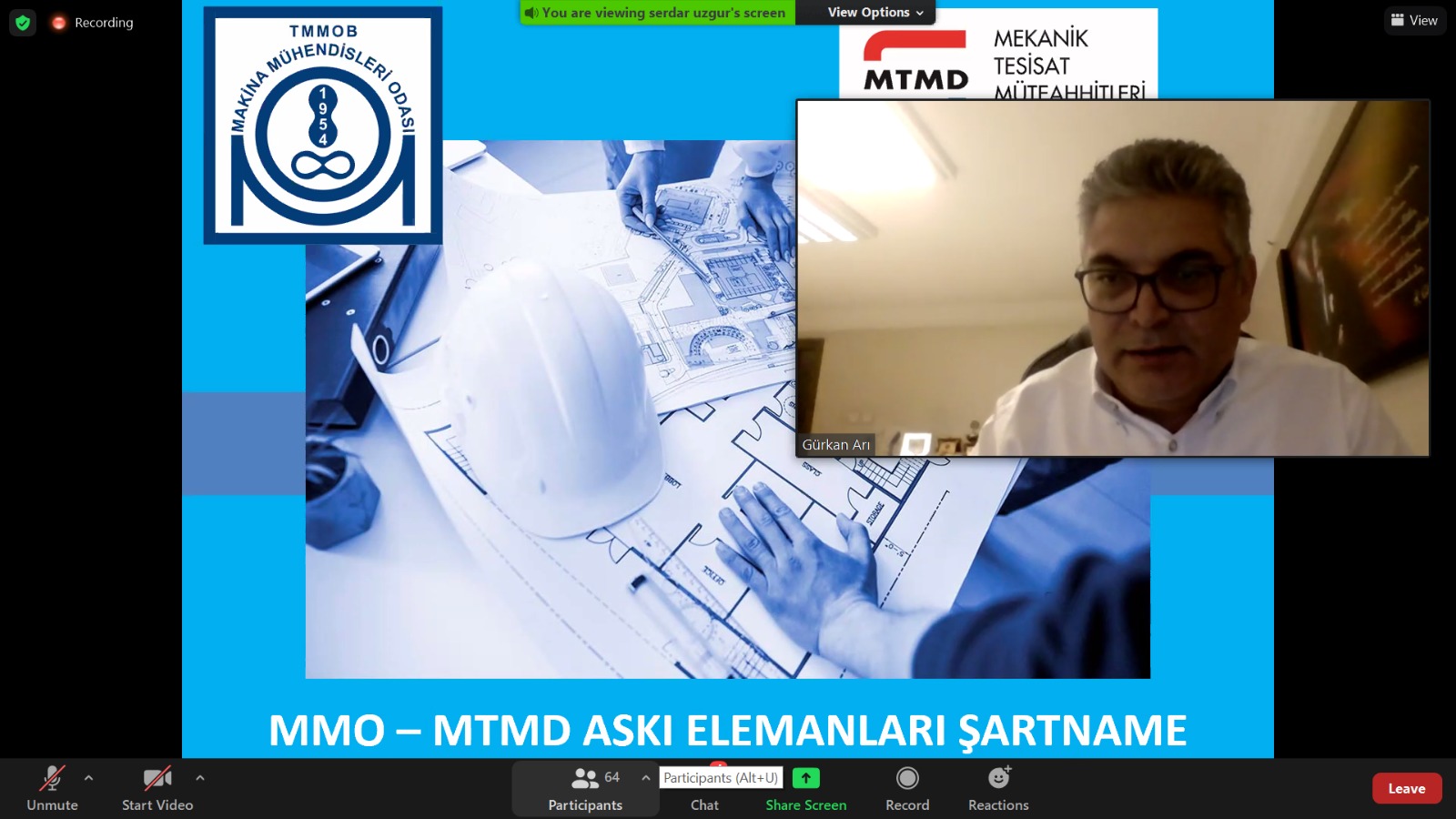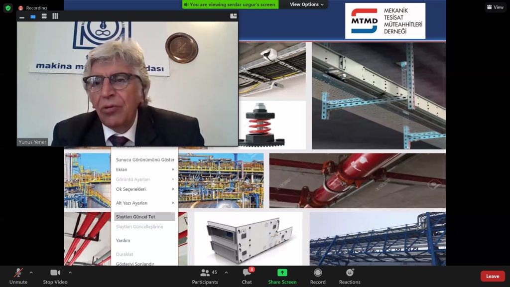 15 Haziran Salı günü Mekanik Tesisat Müteahhitleri Derneği ve Makina Mühendisleri Odası iş birliğiyle Elektromekanik Askı ve Destek Sistemleri El Kitabı Tanıtım Webinarı gerçekleşti. MTMD YK Üyesi, MTMD 6. Dönem YK Başkanı İrfan Çelimli moderatörlüğünde TMMOB, Makina Mühendisleri Odası Yönetim Kurulu Başkanı Yunus Yener webinar açılış konuşmasında, MTMD Yönetimi’ne ve kitabın hazırlanmasında emeği geçenlere teşekkür ederken, sektöre ve mühendislik mesleğine fayda sağlayacak bu tür ortak çalışmaların değerine değindi.